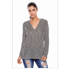 Black hooded v neck long sleeve loose knitted top