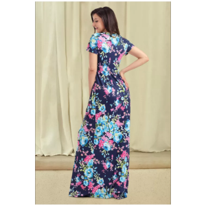 Ladies pocket design short sleeve bright blue floral maxi dress