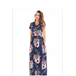 Ladies pocket design short sleeve navy blue floral maxi dress