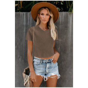 Khaki curled hem short sleeve ribbed knit crop top