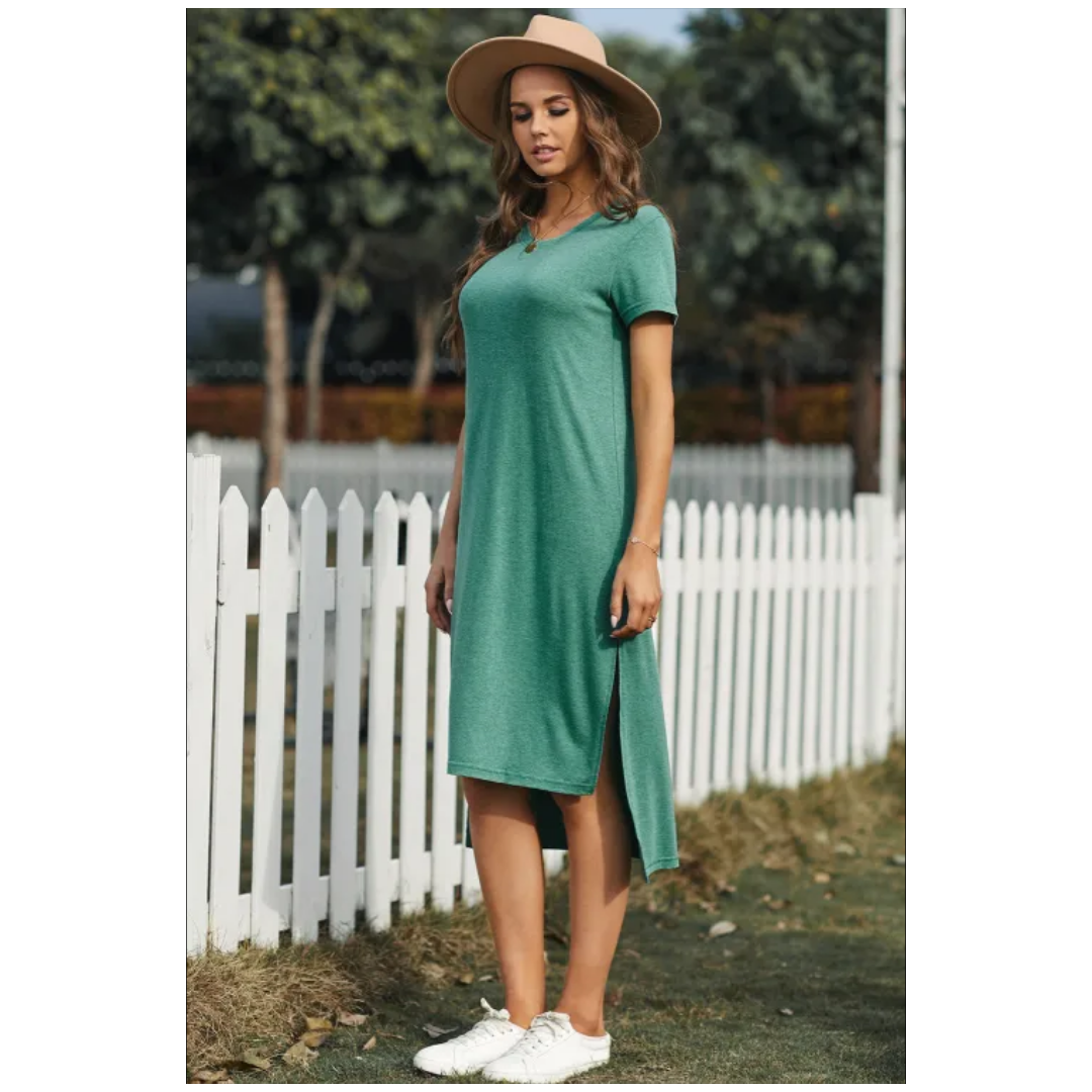 Green casual short sleeve t shirt midi dress with splits