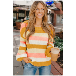 Yellow striped puff sleeve knitted pullover sweater