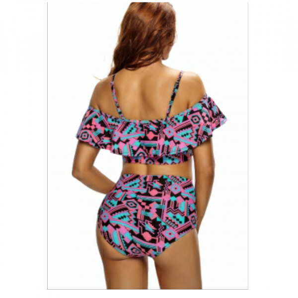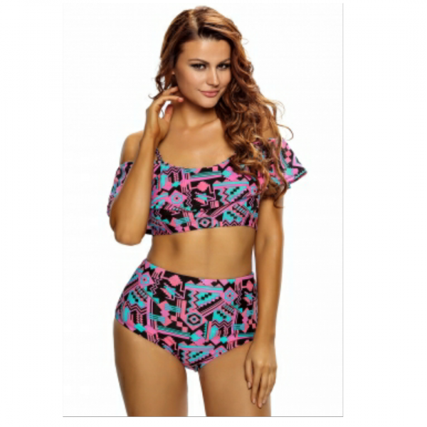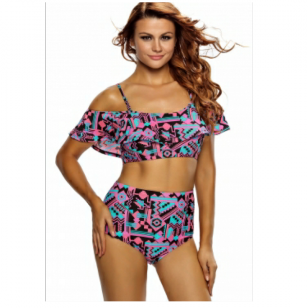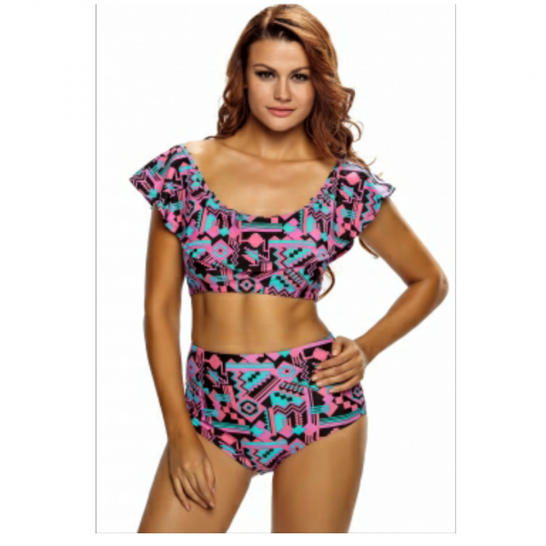 Abstract geometry print ruffle 2pcs swimsuit