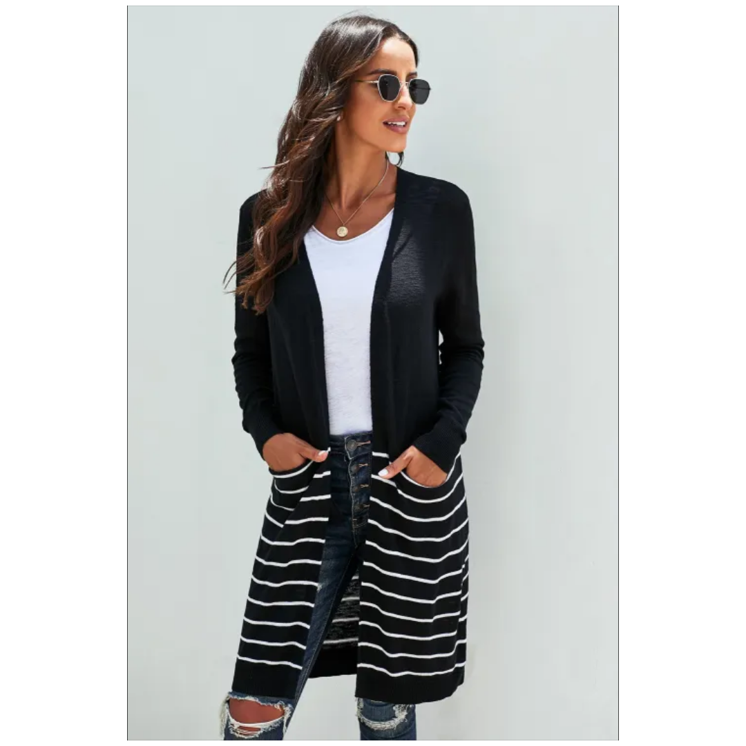 Black open front long sleeve striped cardigan