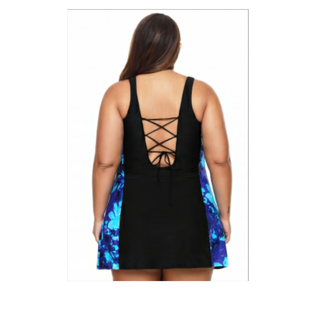 Beautiful print pattern and contrast front panel patchwork create a flattering silhouette on the bluish print black panel front A line swimdress . the A line dress bodice helps hide any problem areas while the trendy design ensures you will stand out on the shoreline . swim bottom attached for one piece design. no underwire . the sponge paddings are unremovable.