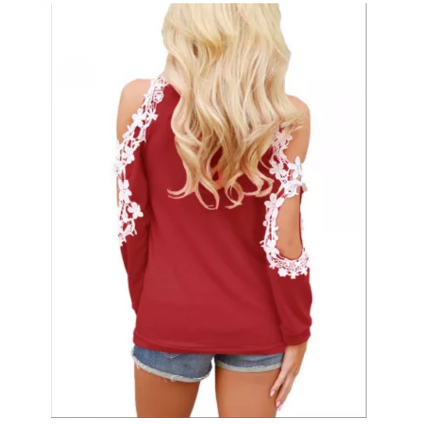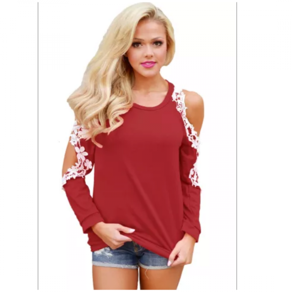 Edgy and bold cold shoulder design complete with delicate lace accents. this long sleeve top for new season must be the next fashion trend icon for women worldwide. it has round neckline, beautiful floral lace trim the cold shoulder and cutouts around elbows. cuff banded at the end of long sleeves and hemline. made of soft stretchy fabric, suitable for most ladies!