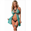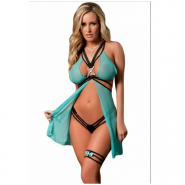 This sexy three piece set feayures a mesh gown with flyaway front and back , strappy neckline , rhinestone x accent , strappy front and back details, strappy side thong and garter with blue satin bow front.