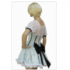 The two piece, victorian alice costume includes a mini dress with black piping detail , mesh top with puff sleeves , black button front , large , black satin back bow and matching underskirt with petticoat .
