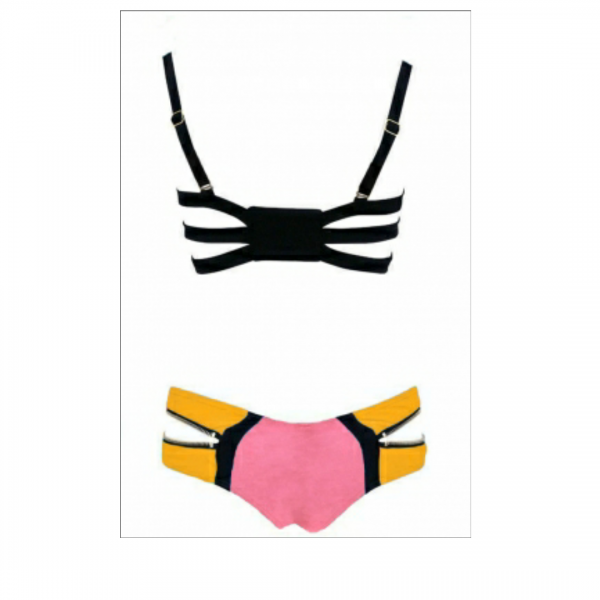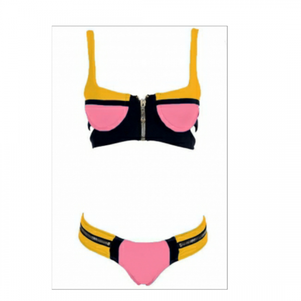The best companion of you this summer , collect this color block lightly padded underwire bikini top with functional zip up closure in front , lined shirred bikini bottom with functional zip up sides and very skimpy back coverage with pucker , open the bottom zip detail then zip decor becomes slits.